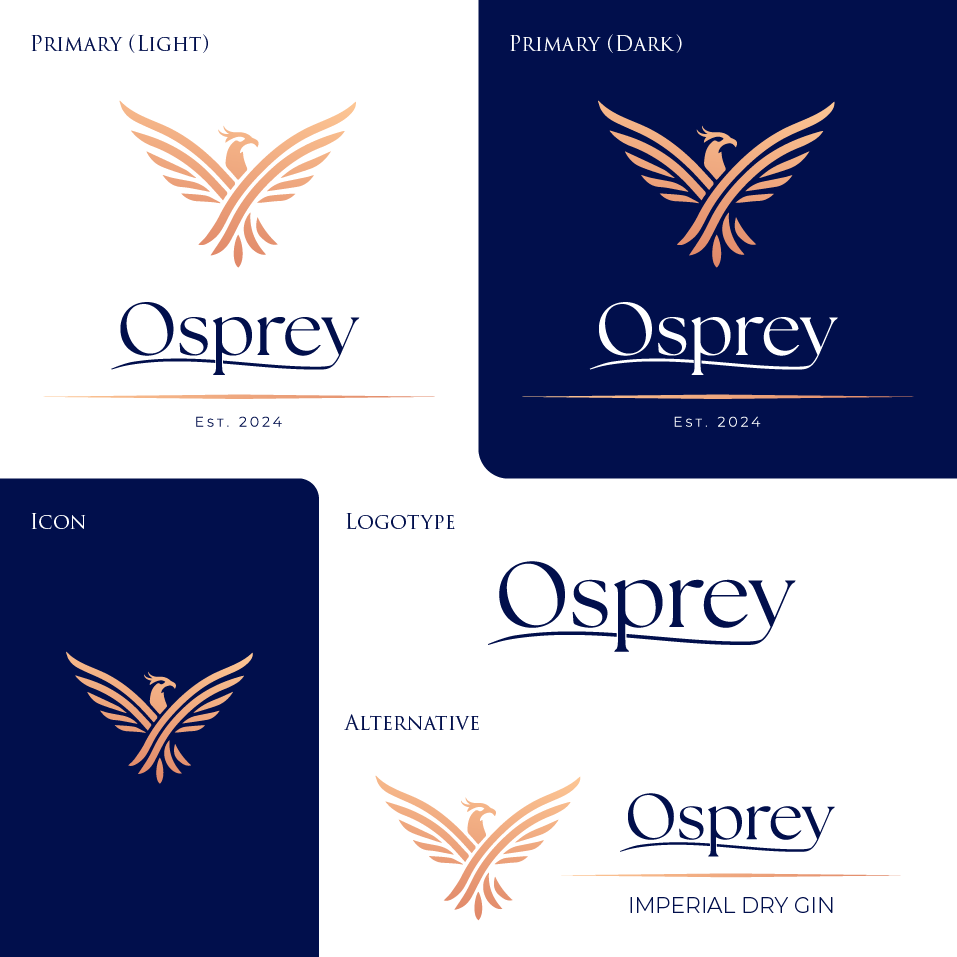 I wanted to experiment with creating a brand that reflects the primary audience of gin drinkers, mainly being members of the upper-class, executives, and people with a taste for luxury. Choosing the name Osprey made sense for a variety of reasons; first, the name itself is a high-class sounding name and can easily resonate with gin drinkers with a premium taste, second, the Osprey bird is known for its focus, skills, and mastery of nature, similar to the brand being a mastery of gin production.